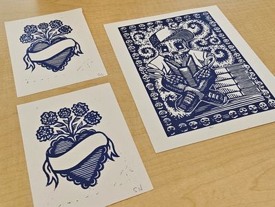 Each print is unique. Linocut blocks are hand carved from mounted linoleum. Prints are pressed on our beautiful Griffin etching press at Amor Eterno Arte. For larger prints we print at Eastside Arts Alliance on their restored American French etching press. All prints are printed with oil ink that cures for 3 days. Our paper is archival 100% cotton. No corporations were used to make these prints. All suppliers are small independent companies.